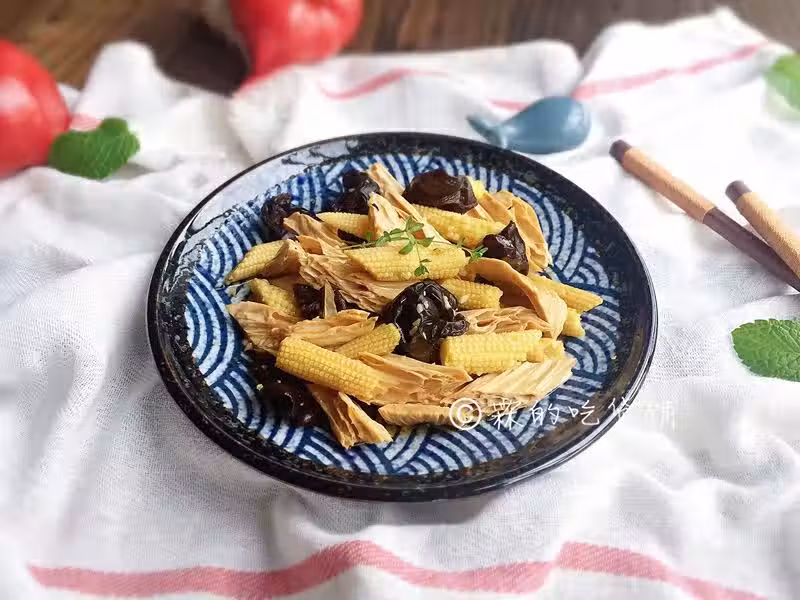 6. 調料澆上汆燙好的玉米筍腐竹拌勻。