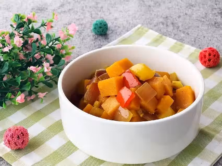 4. 加入少量水,蓋上鍋蓋,小火燜約3分鐘至南瓜熟透