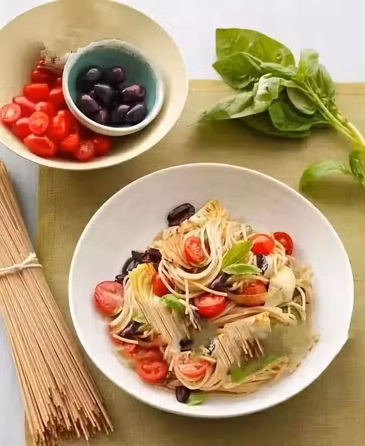 鹽,胡椒粉,400克全麥麵條,2匙橄欖油,1罐朝鮮薊心,1/3杯橄欖,200克櫻桃西紅柿,1/2杯新鮮紫蘇葉。
