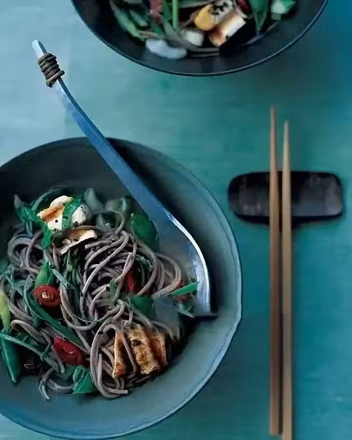 20克生薑,油,1塊豆腐,鹽,胡椒粉,2匙醬油,200克蕎麥麵,1顆小白菜,100克荷蘭豆,1顆辣椒,1匙黑芝麻。