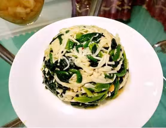 7.再加入金針菇,加醋鼓油麻油鹽生抽拌均!
