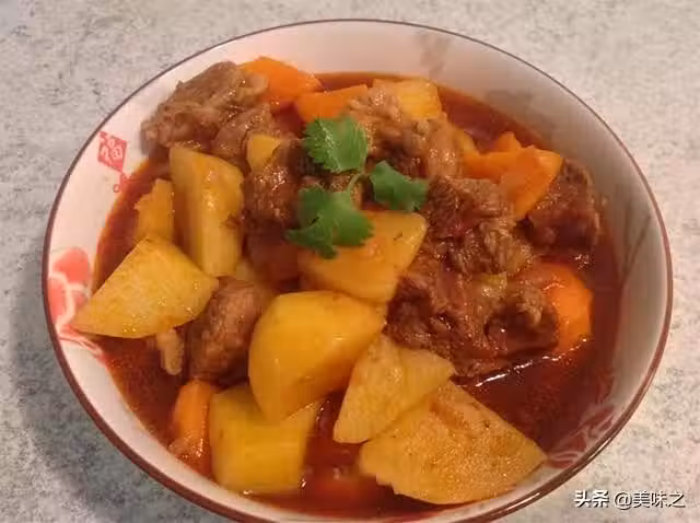 6、同時放入土豆和胡蘿蔔(很多人喜歡在牛肉快燉好後再放,我這裡推薦大家一開始就放,這樣土豆和胡蘿蔔能更好的入味,吸滿湯汁,而且土豆和胡蘿蔔遠比你想像中的耐煮)。