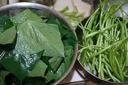 燒開鍋內的水,加入1湯匙鹽和2湯匙油,放入番薯葉燙至葉子變軟,撈起瀝乾水;