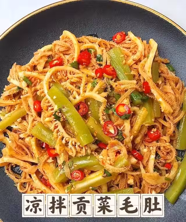 做法:毛肚淘洗乾淨備用,加入姜蔥料酒下鍋.煮10秒左右,撈出過涼水,貢菜泡開,水開下鍋煮10秒左右,撈出過涼水。