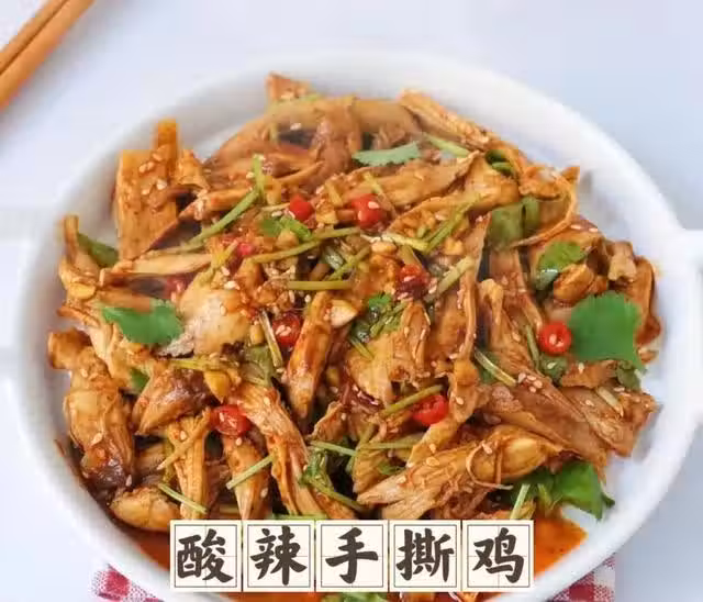 2.用手將雞腿撕成小塊,放入碗中,加入香菜,小米辣,淋入料汁,拌勻即可。