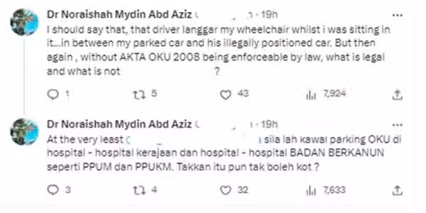 諾萊莎透露,她已針對此事到蕉賴警局報案,並且呼籲各界重視殘疾人士的權益;她也促請部長和政府醫院加強對醫院殘疾人士泊車位的管理。