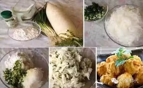 4 、把腌好的蘿蔔絲用手擠去汁,放入蔥花、麵粉、胡椒粉和蘑菇精拌勻.