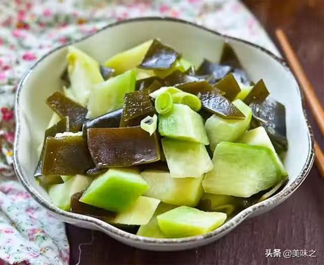 綠蘿蔔適量、海帶適量、蒜苗適量、山茶油適量、鹽適量、生抽適量。