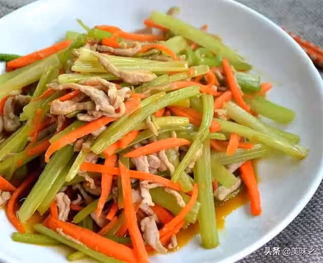 芹菜250克、胡蘿蔔半根、精肉100克、生抽1大勺、鹽少許、料酒1勺、生粉適量、胡椒粉少許、白糖1勺。