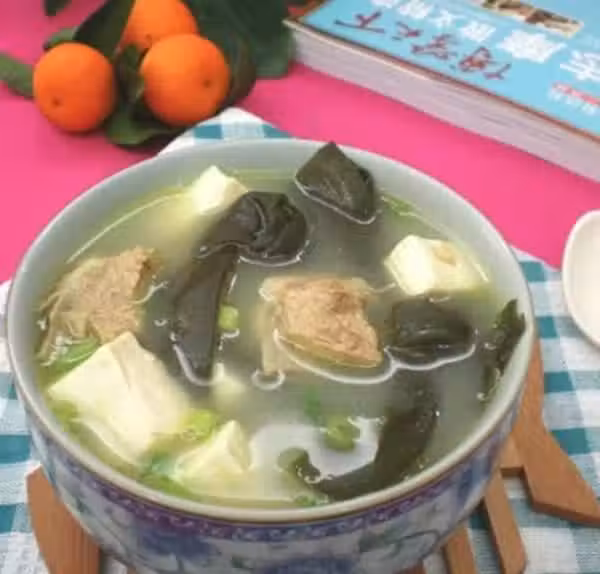 1、脊骨洗淨,放入沸水中焯燙兩分鐘撈出洗淨豆腐切小方塊放沸水中焯燙2分鐘撈出瀝幹海帶結洗淨