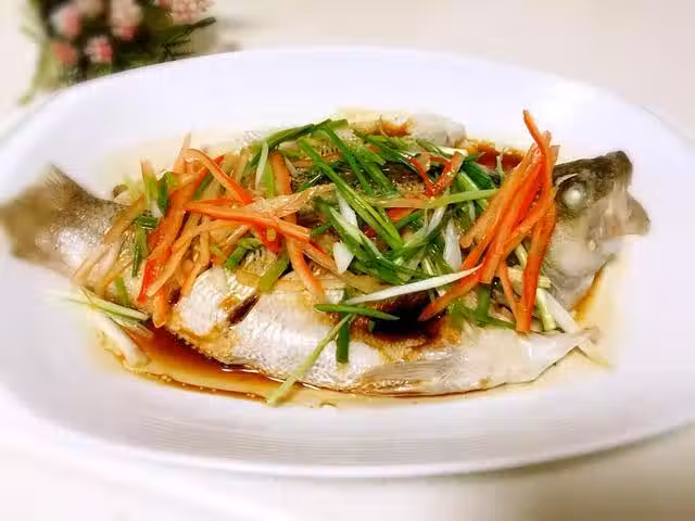 用料:鱸魚1條、植物油2湯匙、蒸魚豉油2湯匙、姜1塊、小蔥2根