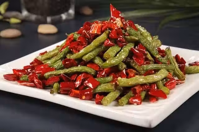 2.把豆角用油小火煸到起皺褶,煸好後 盛出備用