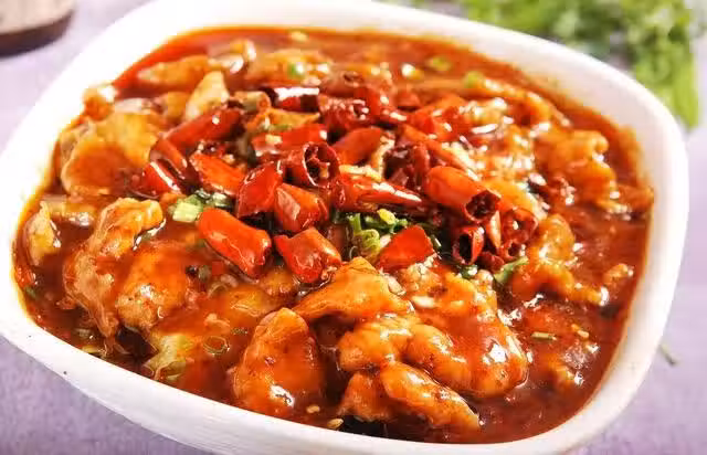 15、鍋內燒熱2大匙油及2大匙紅辣椒油。