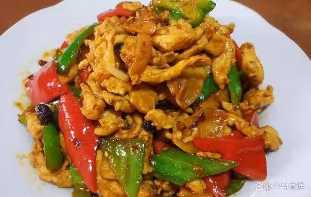 1.雞胸肉改刀切成片,下入清水鍋中,汆水變色,迅速撈出沖涼備用。適量青紅辣椒改刀切成菱形片備用。