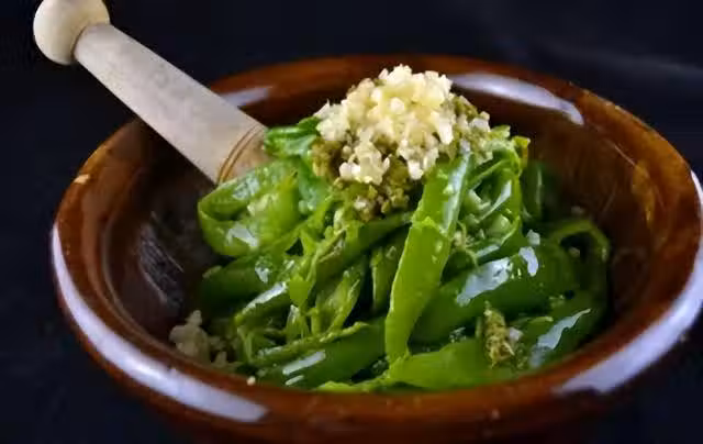 3.蒜臼里再放入剝皮的皮蛋搗碎,青椒撕條同樣放入蒜臼,再放入調好的蒜汁一起上桌,吃的時候攪拌幾下即可。