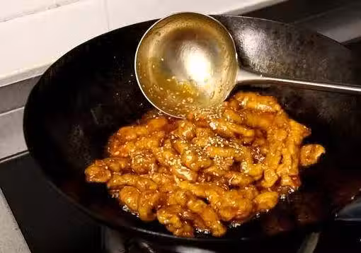 等湯汁粘稠後放入裡脊肉,快速翻炒讓裡脊肉充分裹勻糖醋汁,再撒入適量熟芝麻,翻炒均勻後就可以出鍋了。最後,在上面撒點熟芝麻點綴一下就可以了。