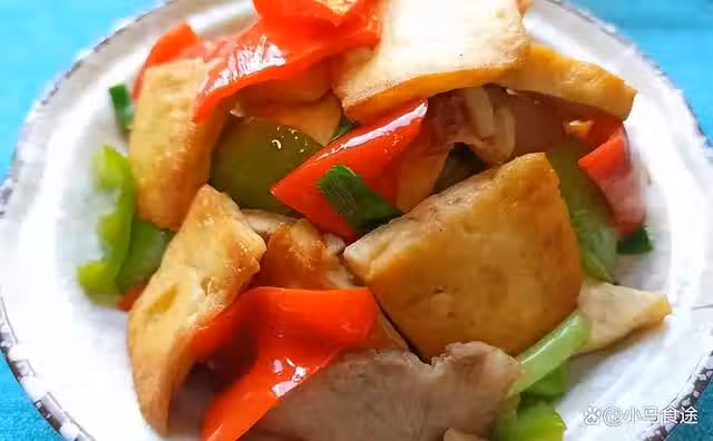 1.豆腐切成方形薄片,鍋燒菜籽油,把豆腐放入鍋中攤平,撒一些食鹽,開中火煎至兩面金黃,出鍋備用。