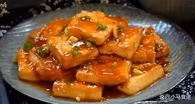 4.鍋留底油,下入蔥花,大火爆香,倒入豆腐,加入2中調好的醬料,大火收汁,即可裝盤。
