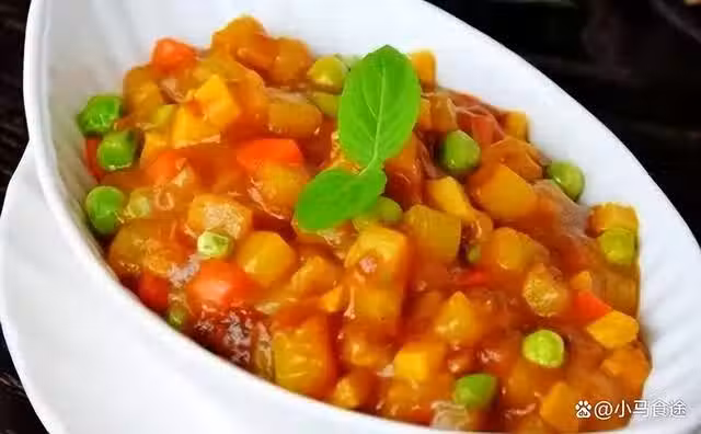 2.起鍋燒油,爆香蒜末,倒入咖喱塊,炒出香味,倒入土豆丁翻炒片刻,然後放入杏鮑菇丁,胡蘿蔔丁,再次翻炒片刻,加入適量的清水,加入鹽、白糖,少許胡椒粉,加蓋大火燉煮,燉20分鐘,土豆熟後加入青豆,待湯汁濃稠關火,即可出鍋裝盤。