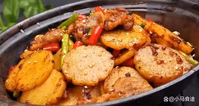2.起鍋燒油,燒到五成熱,放入豆瓣醬炒出紅油,加入姜蒜炒香,然後放入土豆和蓮藕慢慢煸炒至熟,加入洋蔥、臘腸、蒜苗梗翻炒均勻,接著加入杭椒塊、蒜苗葉,調入適量鹽和生抽,翻炒均勻,即可出鍋,放入燒熱的干鍋中,邊加熱邊食用。