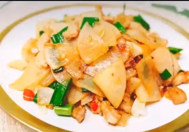肉炒白蘿蔔片,這道菜要吃出白蘿蔔的脆感,所以需要用鹽提前腌一下,腌出多餘的水分,再拽干多餘的水分,這樣炒出來的白蘿蔔片吃著更清脆,更下飯。