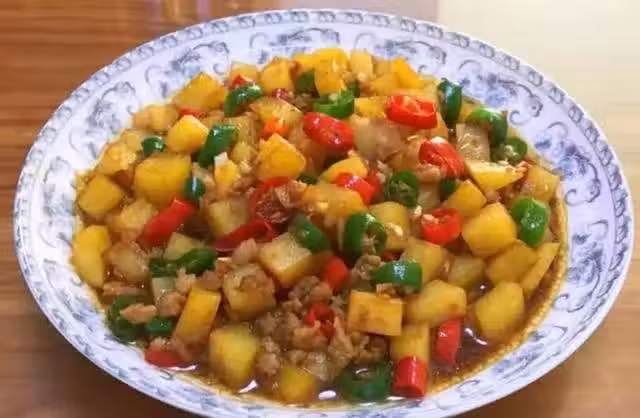 肉末土豆丁,這款肉末土豆丁不同之處在於加入了青紅二荊條辣椒,增加了菜品的色澤和鮮辣味,愛辣人士會喜歡這款菜,獨特的風味,特別下飯。