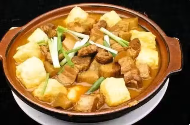 肉燒老豆腐,北方人愛吃的下飯菜之一,典型的燉菜,豬肉切塊燉成紅燒肉,下入炸過的豆腐塊,燉煮入味,收汁濃稠,豆腐吸收了肉的油香,肉也吃著不膩口,是一款非常好的下飯菜。