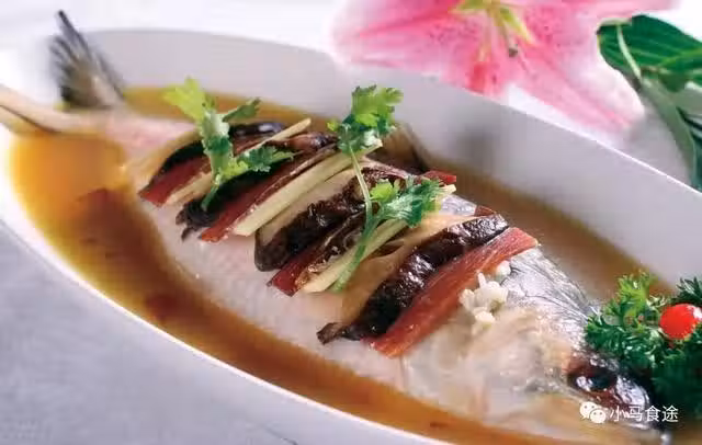 3.將加吉魚用料酒、姜、蔥、鹽、味精、醋腌漬約20分鐘。將火腿、冬菇、冬筍間隔擺放在魚體表面,再撒上海米,淋上豬油,入籠用旺火蒸熟後,去掉姜蔥,附姜味碟上桌即可。