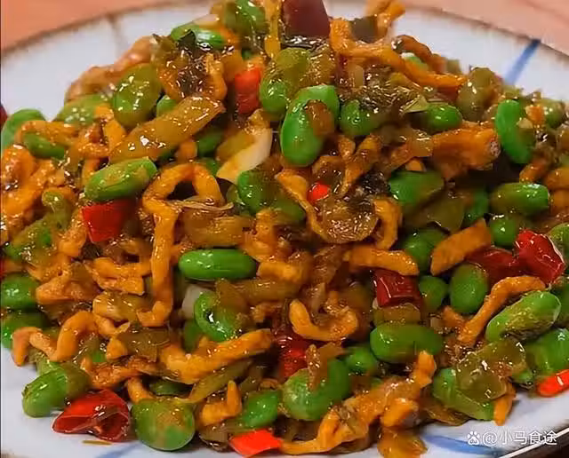 3.再起鍋燒油,下入姜蒜,干辣椒節,小米辣圈爆香,下入毛豆炒斷生,下入一包雪菜王,下入肉絲,充分翻炒均勻,即可出鍋裝盤,你覺得怎麼樣?妥妥的下飯神器。