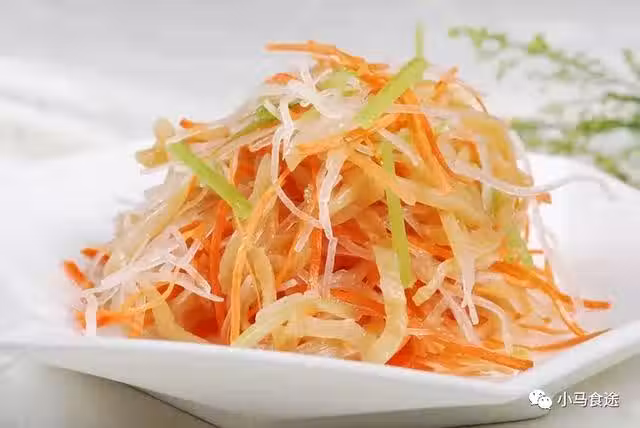 3.將白糖、食鹽、味精倒在盤內三絲上,淋入食醋拌勻即可。
