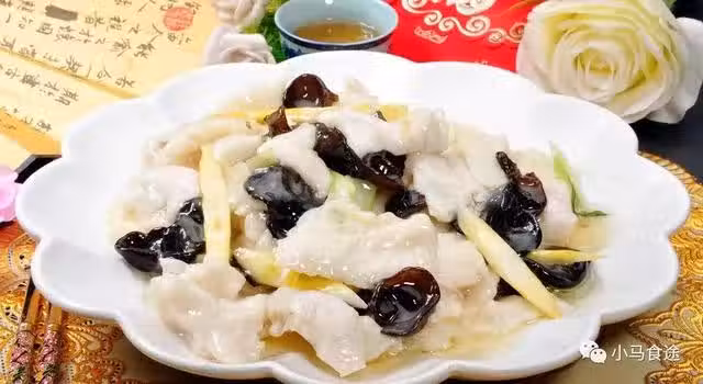 1. 魚肉去皮去刺,用刀片成約5厘米長、3.5厘米寬、0.3厘米厚的片,用鹽、蛋清豆粉、料酒拌勻。冬筍片用開水焯熟。蔥切成"馬耳朵"形。