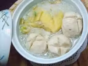 3、 蒜下鍋炸香至表面金黃色後加水以及肉丸煮至開 倒入香花煮片刻再倒入米粉,加適量鹽、少許幹貝素調味、最後撒上麻油以及蔥花煮一下即可。