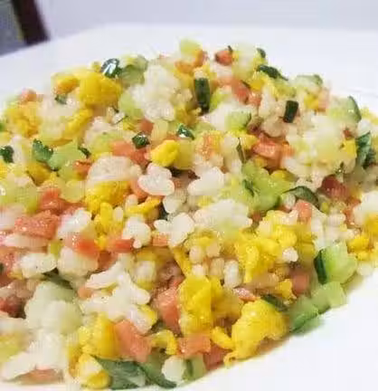 米飯2碗;火腿半根;雞蛋2個;黃瓜1根;蔥半根;鹽(根據個人口味)2小勺;油1大勺