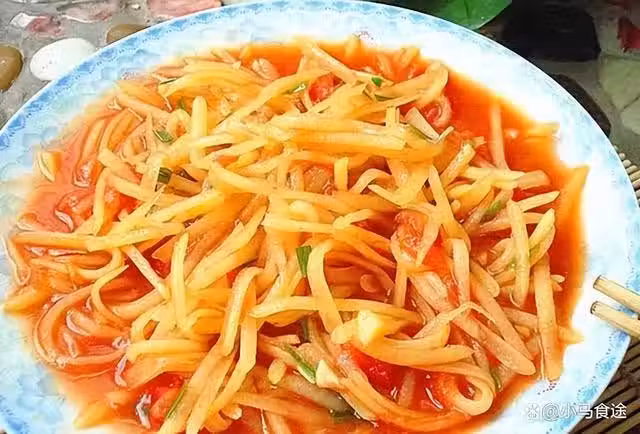 西紅柿炒土豆絲,很多人沒吃過這道家常菜,西紅柿不僅可以炒雞蛋,也可以用來炒土豆絲,其自身帶的酸味,炒出來的土豆絲酸爽開胃,湯汁拌飯也非常好吃。