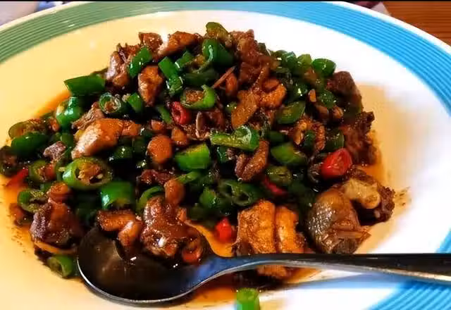 這款下飯菜鮮辣適口,雞肉乾香,仔雞不用上漿不用汆水,直接剁成小丁,加入鹽、料酒、胡椒粉、水澱粉攪拌均勻。過油炸干香。接著鍋里留底油,下入青紅尖椒段和仔薑片翻炒出香,炒出辣椒的糟性,下入雞丁煸炒出香,調入基本味,料酒、鹽和雞精,即可出鍋,煸炒出來的雞肉特別入味,尖椒也經過煸炒,辣度明顯下降更多,只剩下香味了。