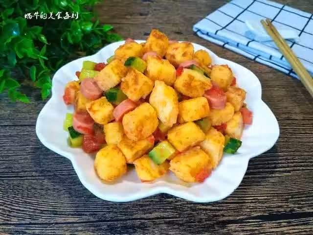 1,香腸一根切成大點丁,黃瓜半根切小塊,番茄切小塊,饅頭一個切成小塊。