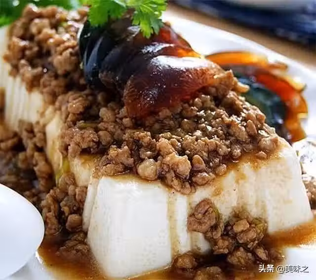 8、把做好的肉末澆在內酯豆腐上,最後撒上香菜末拌勻就行了。