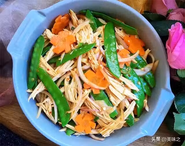 荷蘭豆適量、胡蘿蔔一根、腐竹適量、蔥適量、蒜適量、洋蔥適量、油適量、鹽適量、醋適量、醬油適量、辣椒粉適量。