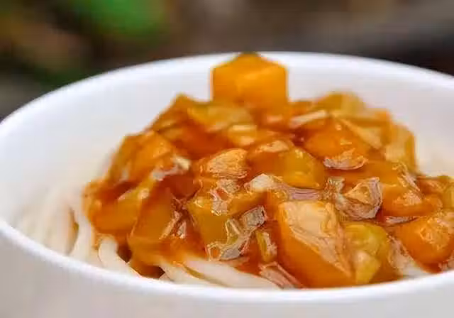 茄子澆頭面,茄子切丁拍粉,下入七成熱油鍋中炸金黃即可出鍋瀝油。鍋留底油,下入蔥薑末和一半的蒜末炸香,加入番茄醬炒出紅油,加水清水燒開,調入鹽、胡椒粉、白糖、香醋、醬油、味精,接著勾芡,下入炸過的茄丁,收濃湯汁,茄子均勻裹上醬汁使其入味,再加入另一半的蒜末,蔥油攪拌均勻即可澆在煮熟的麵條上,這款茄子澆頭面就做好了。