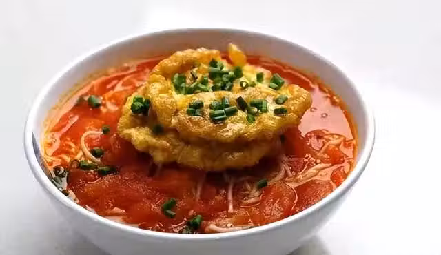 皮紅沙心的西紅柿放入開水中,燙掉外皮,改刀切小丁。起鍋燒油,下入化豬油燒至三四成熱,下入蔥薑末爆香,下入西紅柿炒出濃汁,加入鮮湯燒開,調入鹽、味精、胡椒粉,燒入味即可出鍋,澆在煮熟的細掛麵碗里。