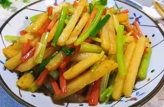 2.起鍋燒油,下入蔥段炒香,下入土豆條炒均勻,調入醬油、生抽炒至上色,下入芹菜和紅椒,再次調入鹽、味精、胡椒粉,下入韭菜段炒斷生即可出鍋裝盤。