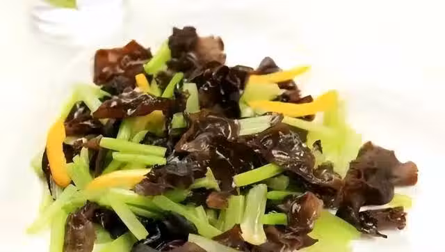 2.起鍋燒油,下入芹菜炒香,下入木耳炒幾下,調入鹽、味精、米醋即可炒勻出鍋裝盤。