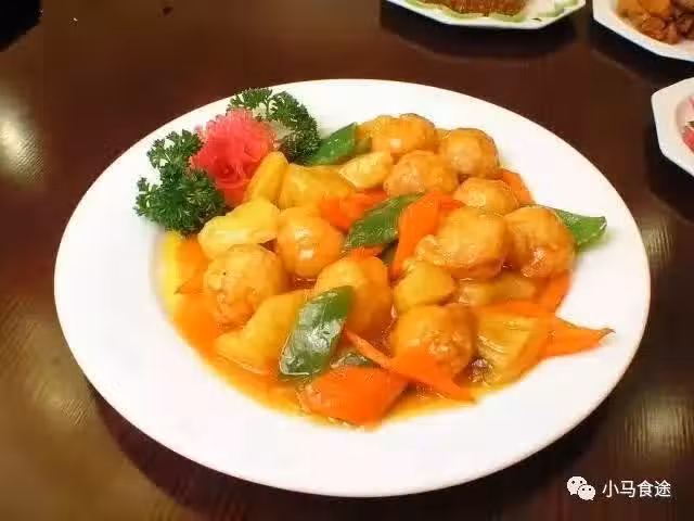 1.雞腿肉切片,加鹽 、味精、生粉、食粉 、水腌20分鐘,在4成熱油中滑熟成球 。