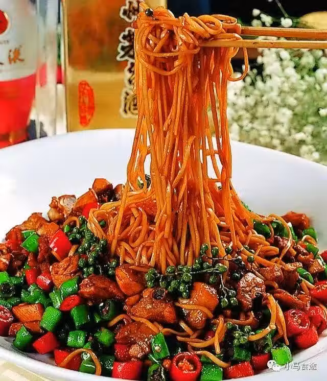 5.鍋留少許油,下入藤椒、蔥姜蒜炒香,下入雙椒煸炒出香,略微起虎皮,下入麵條炒勻,調入鹽、香料粉、醬油、味精、雞精、花椒油、香油炒勻即可出鍋裝盤食用。