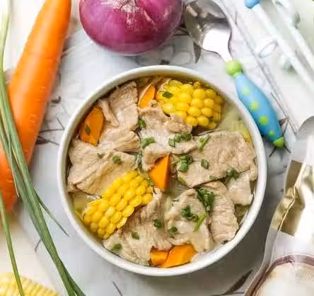 梅條肉100g;玉米半根;胡蘿蔔1小根;洋蔥1/4個;包菜1/4個;鹽(腌肉用)1g;糖(腌肉用)2g;老抽(腌肉用)5ml;玉米澱粉(腌肉用)20g;食用油(腌肉用)2g;鹽1克;糖2克;生薑3-4片;大蔥3段;胡椒粉0.5g;小蔥2根