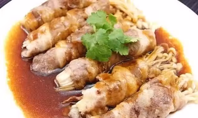 金針菇250克、肥牛片250克、蚝油1大匙、白糖1小、匙清水1小杯(約80ML)