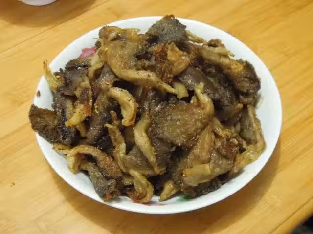 6、炸好的平菇放入一個大些的盆里,用放澱粉的方法放入適量的花椒鹽,充分裹勻,即可裝盤。