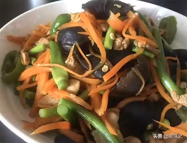 豬肉適量、胡蘿蔔適量、蒜苔適量、黑木耳適量、辣椒適量、大蒜適量、生抽適量、鹽適量。
