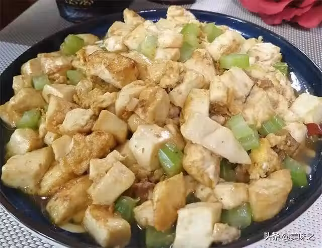 西芹適量、嫩豆腐適量、肉絲適量、油適量、蚝油適量、蒜末適量、生抽適量、糖適量、五香粉適量。