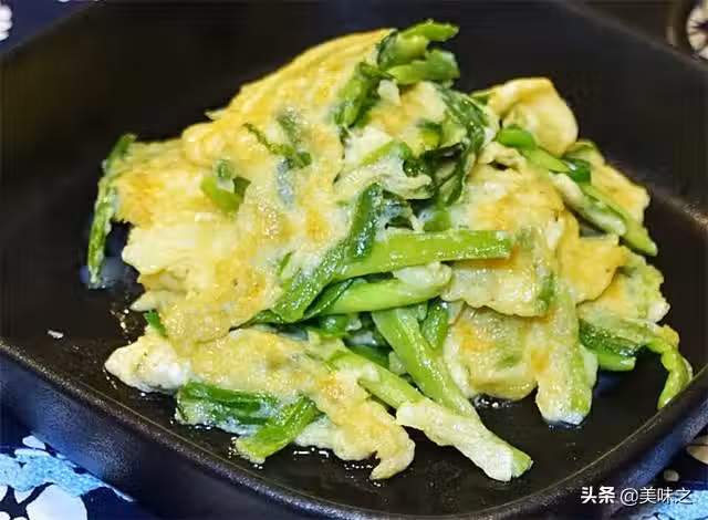5、鍋置爐上,升中高火,鍋熱收中小火,倒入蛋液和蒜苗,收小火,將蛋液四周向內翻,翻至蛋八、九成熟可盛起食用。